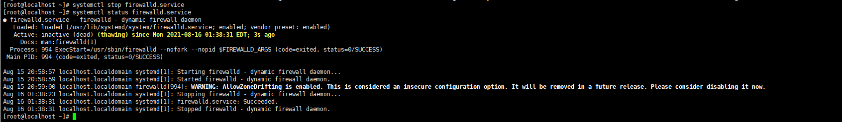 [root@localhost ~]# systemctl stop firewalld.service