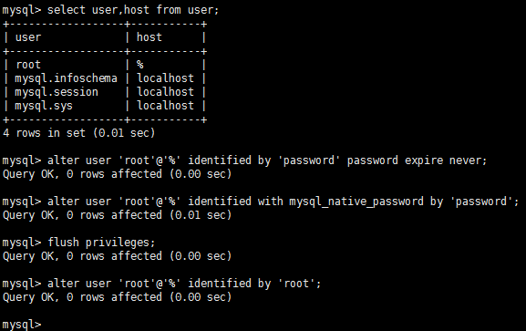 mysql> alter user 'root'@'%' identified by 'password' password expire never;
