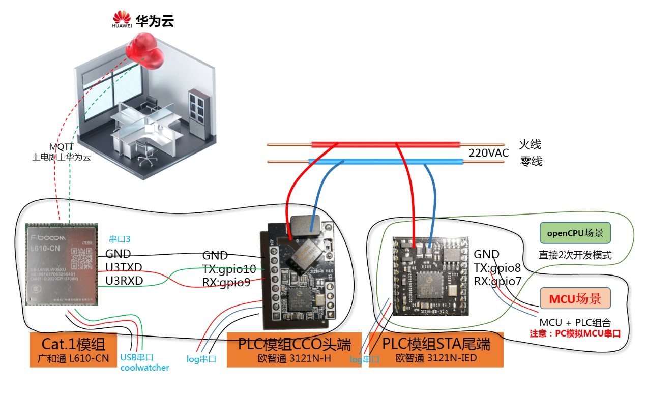 ( 1 ) 现在实现 一个 华为云 smart 智联 Cat.1+PLC 无线网关 。 技术点 : Cat.1 模组 、 PLC 模组 、上电即上华为云  整体 方案介绍: ( 1 ) PLC 无线 网关 : 由 PLC 模组 CCO 头端(欧智通 3121N-H 型号) 、Cat.1 模组( 广和通 L610-CN 型号)构成 。 PLC 和 Cat.1 通过 串口相连。 PLC 头端 CCO 通过电力线 ( 22 0V 交流电) ,接收到 PLC 尾端 STA 发的 数据 ,经过 Uart 给 Cat.1 , Cat.1 模组 解析数据, 使用 MQTT 协议发到 华为云, 实现 上电即上云 。华为云 的控制命令, 按 相反路径,发给STA 尾端 。 ( 2 ) 智能设备 ( 例如插座 ) : 嵌入 PLC 模组 STA 尾端( 欧智通 3121N-IED 型号)。 有 MCU+PLC 、 openCPU 这 2 种 开发模式。 本次 采用 MCU+PLC 开发 ,使用 PC 串口 调试助手模拟 MCU 的数据 收发。 【答 开发者 】头端 和尾端, 可以 选用相同的 PLC 型号 。 一套 代码,可以同时 生成 CCO 头端 和 STA 尾端固件 。