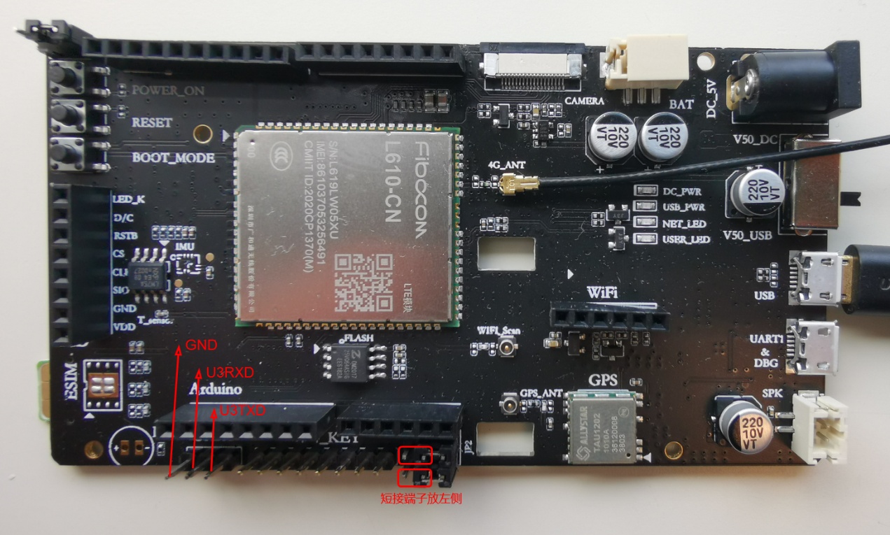 ( 1 )按照 下图的管脚编号,进行硬件接线。  ( 2 ) C at.1 的 环境,我使用的是 FIBOCOM L610-AEVK 开发板 。注意串口 3 的 GND 、 U3RXD 、 U3TXD 的 位置。 开发板 的串口 3 功能 和 GPS 功能 通过 JP2 进行 选择, 短接 端子放在左侧,就可以选择使用串口 3 功能 。  |
