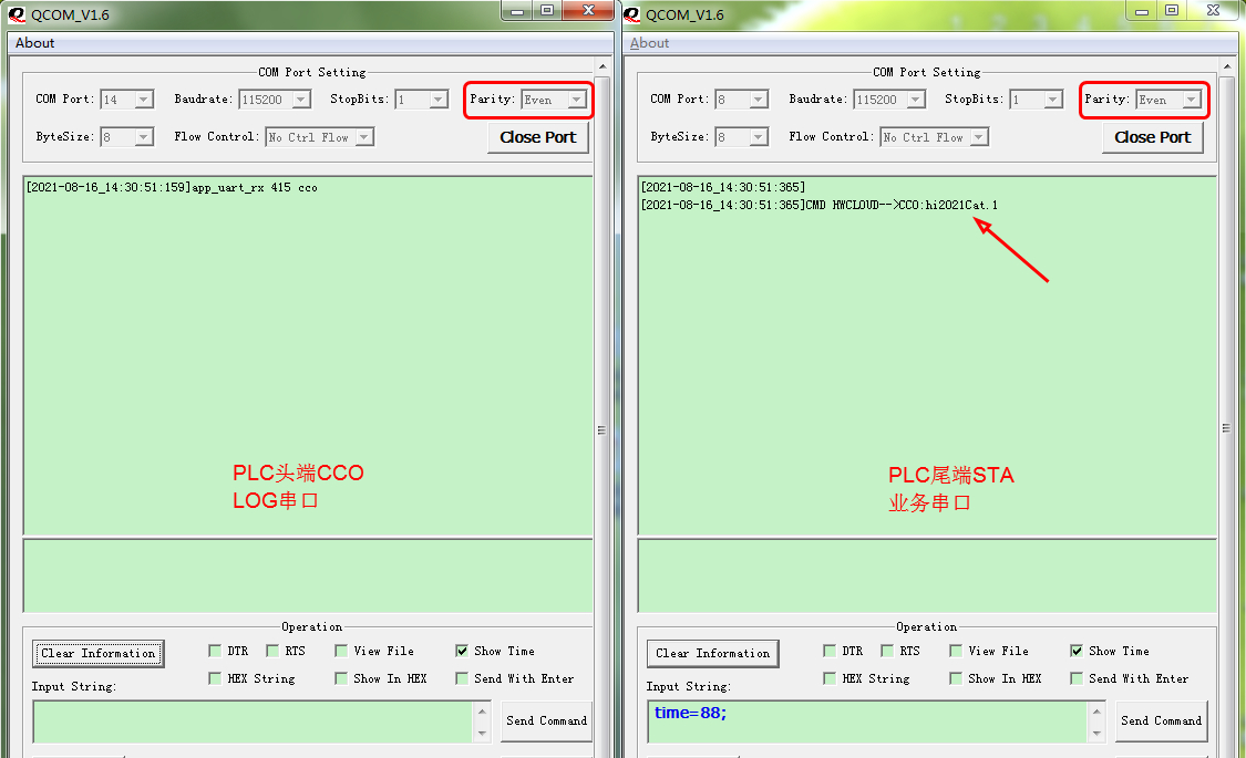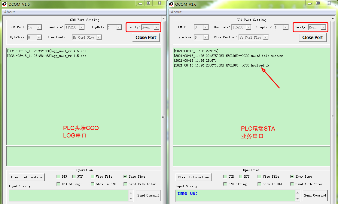 ( 1 ) 打开 PLC 模组 CCO 的 LOG 串口 。 打开 PLC 模组 STA 尾端 的业务串口 ( 不是 LOG 串口 ) , 业务 串口用于外接 MCU ,模拟 真实设备( 例如 插座) 的 数据收发和命令控制。 注意: 串口调试助手的校验, 选择 Even 。 ( 2 ) 当 STA 业务 串口出现hwcloud ok , 表示Cat.1 模组准备 好, 已经 连接上华为云平台。  ( 3 )现在设计 一个简单的通讯协议。 【 1 】 尾端 STA 通过 PLC 网络 , 发送 xxx 字符串 。 【 2 】头端 CCO 接收 xxx 字符串,组合 打包成CCO01:{STA01:xxx} 字符串, 通过串口发给Cat.1 模组 。 【 3 】 Cat.1 模组 收到CCO01:{STA01:xxx} 字符串,解析 出 x xx ,通过 无线发给华为云。