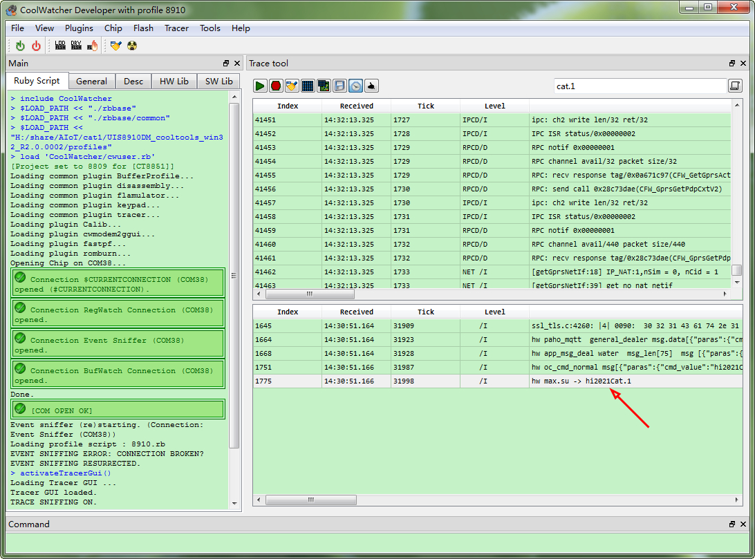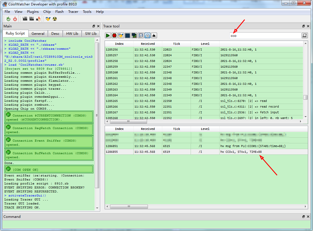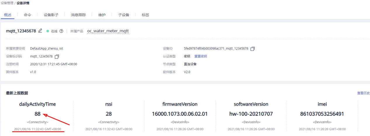 ( 4 )实际 运行如下 。 【 1 】在 PLC 尾端 STA 的 业务串口,输入 time=88; 字符串(不要 选择Send with enter ), 点击Send Command 。 【 2 】经过 PLC 网络 , 头端 CCO 接收 到 数据 后,进行 汇总打包 CCO01:{STA01:time=88;} 字符串。 发给Cat.1 模组 。 【 3 】 Cat.1 模组 收到 CCO01:{STA01:time=88;} 字符串,解析 出CCO=1, STA=1, time=88 ,通过 MQTT 协议 发给华为云。  ( 5 ) 在 CoolWatcher 下 搜索 Cat.1 模组 的 运行 LOG , 可以 看到 成功解析 PLC 消息 。  ( 6 )登录 华为云 , 显示 已经 收到最新上报数据 , time=88 。   |