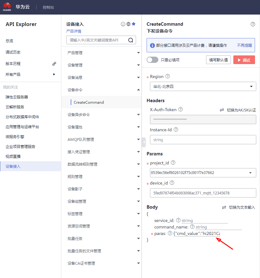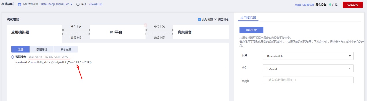 ( 1 )进入 华为云 API E xplorer 。 https://apiexplorer.developer.huaweicloud.cn/apiexplorer/debug?product=IoTDA&api=CreateCommand ( 2 )选择 CreateCommand 下发设备命令。 ( 3 )填入设备 ID 等 参数。 参数 区写入 {"cmd_value":"hi2021 Cat.1 "} 。  ( 4 )点击 调试 。华为云页面 显示 调试 成功。  ( 5 ) PLC 尾端 STA 模组 的串口调试助手, 显示 收到 hi2021Cat.1 的 命令。 路径 是华为云,到Cat.1 模组 ,到 CCO 头端 ,经过 PLC 网络 ,到 STA 尾端 , 最终 从串口输出。   |