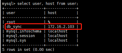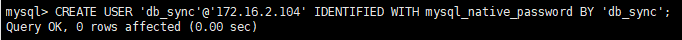 mysql> CREATE USER 'db_sync'@'172.16.2.104' IDENTIFIED WITH mysql_native_password BY 'db_sync';