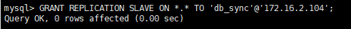 mysql> GRANT REPLICATION SLAVE ON *.* TO 'db_sync'@'172.16.2.104';