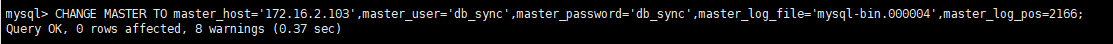 mysql> CHANGE MASTER TO master_host='172.16.2.103',master_user='db_sync',master_password='db_sync',master_log_file='mysql-bin.000004',master_log_pos=2166;