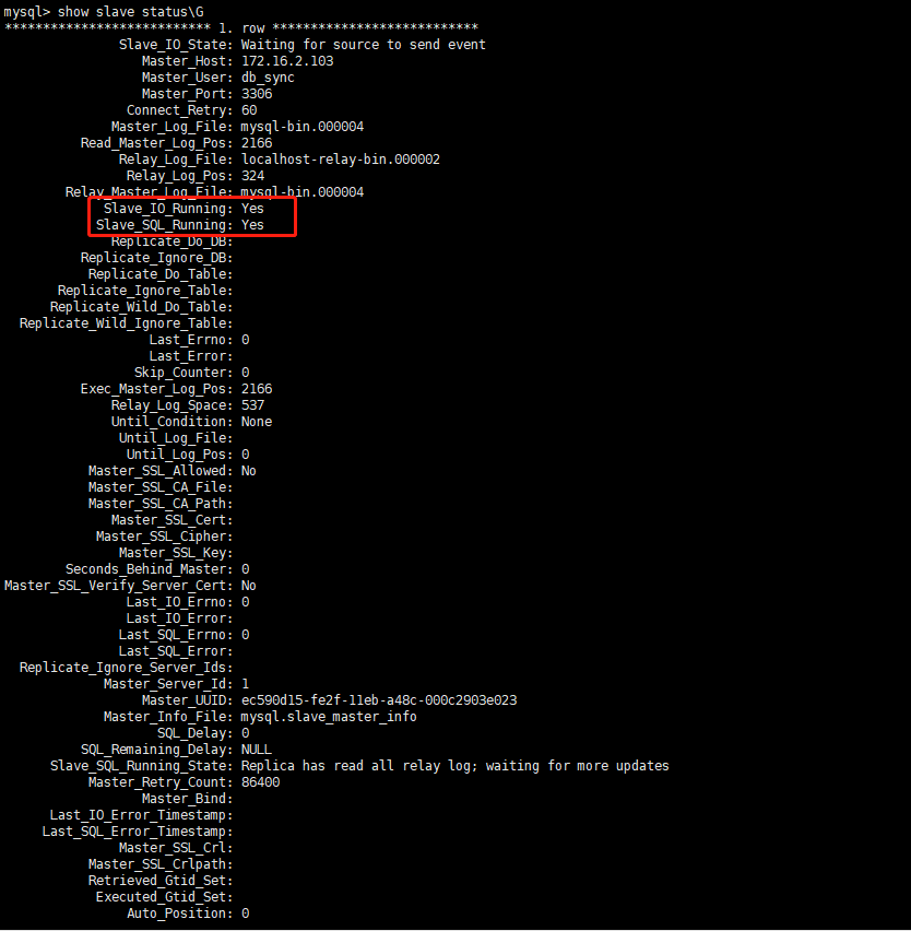 说明:从库状态Slave_IO_Runing和Slave_SQL_Runing都为Yes说明同步成功,如果不是这两个值,请检查 error_log,然后排查相关异常。