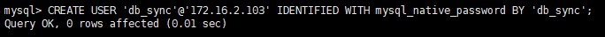 mysql> CREATE USER 'db_sync'@'172.16.2.103' IDENTIFIED WITH mysql_native_password BY 'db_sync';