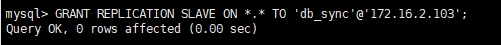 mysql> GRANT REPLICATION SLAVE ON *.* TO 'db_sync'@'172.16.2.103';