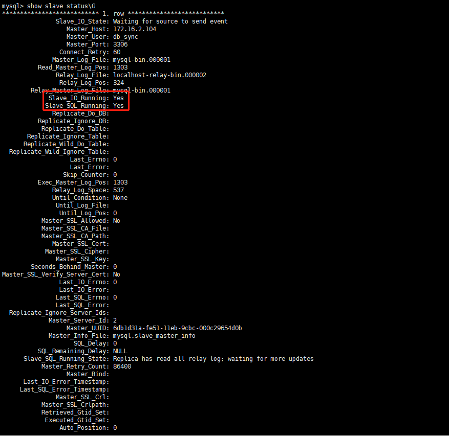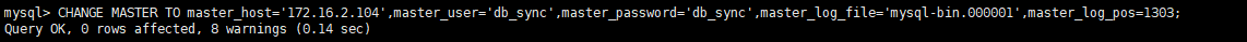 mysql> CHANGE MASTER TO master_host='172.16.2.104',master_user='db_sync',master_password='db_sync',master_log_file='mysql-bin.000001',master_log_pos=1303;