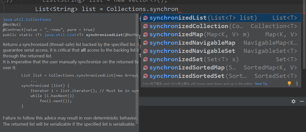 Collections是一个工具类,不能被实例化,提供了许多强大而丰富的集合相关的静态方法,其中就包括处理集合中的线程安全问题的各种同步方法,例如: