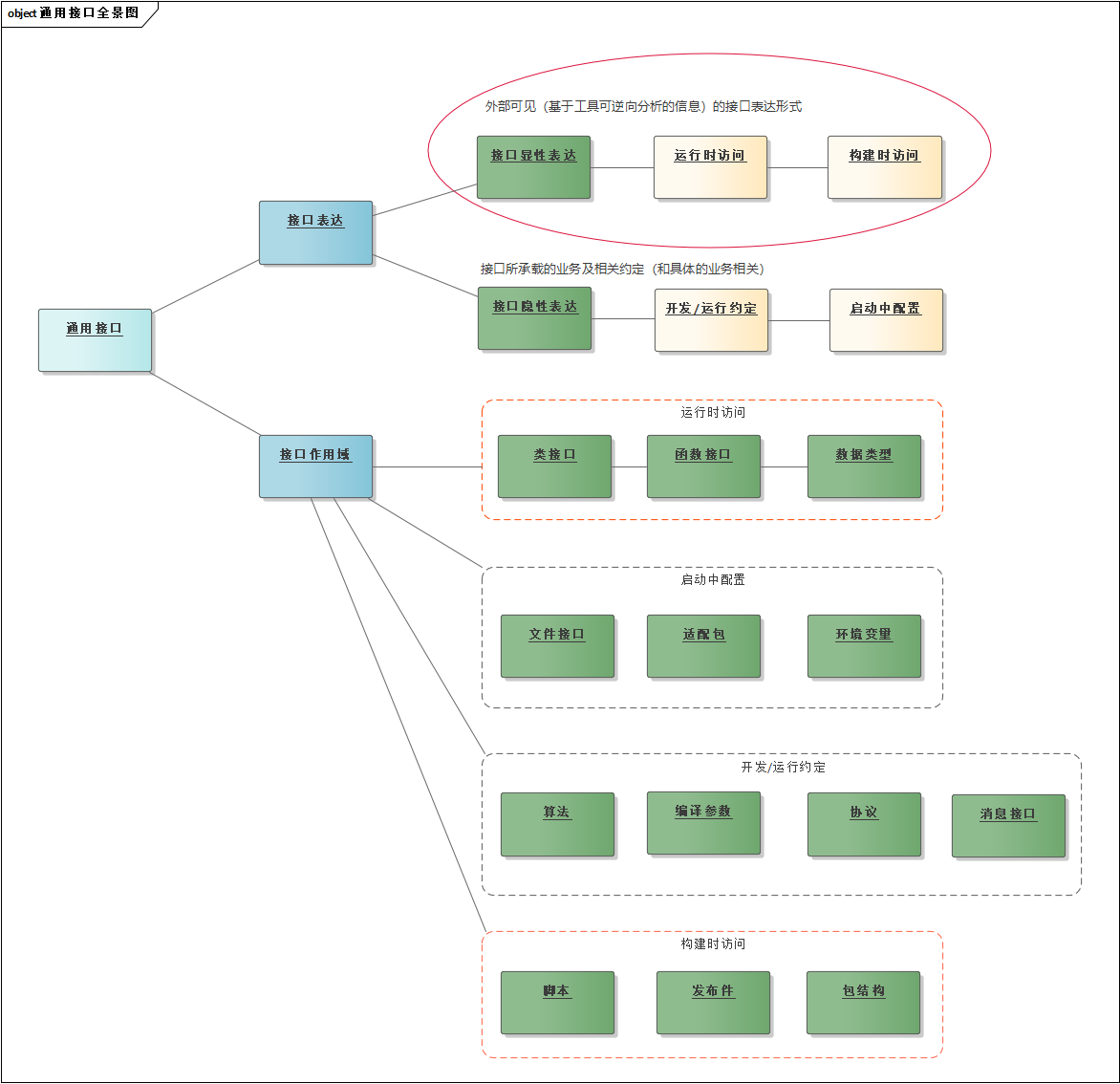 如上描述的,接口定义了多个软件中介之间的交互形式。狭义上来说一般指函数、约定的消息接口等等,广义上来看,接口指的更多软件之间依赖的具体表达形式。从广义上梳理来看,可以从如下两个维度理解接口: