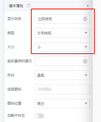 属性修改:显示名称改成”立即使用“,类型选择”文字按钮“,大小选择”小“。