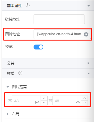 属性修改:设置图片地址(直接通过齿轮选择对应图片),设置图片宽高为48px*48px。