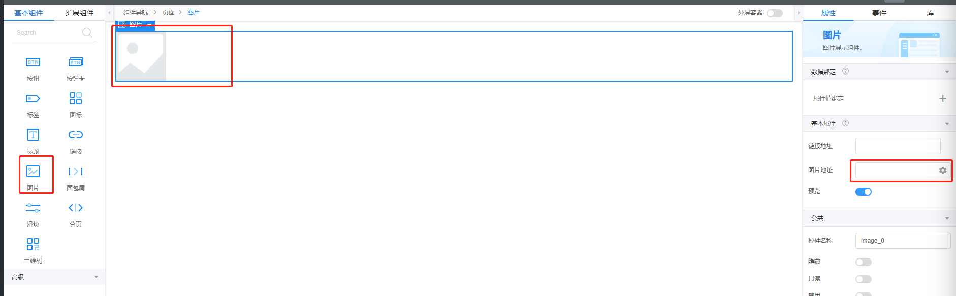 (2)在界面拖放一个图片控件,选中该控件,点击右侧属性中的图片地址的小齿轮,可以打开图片上传界面