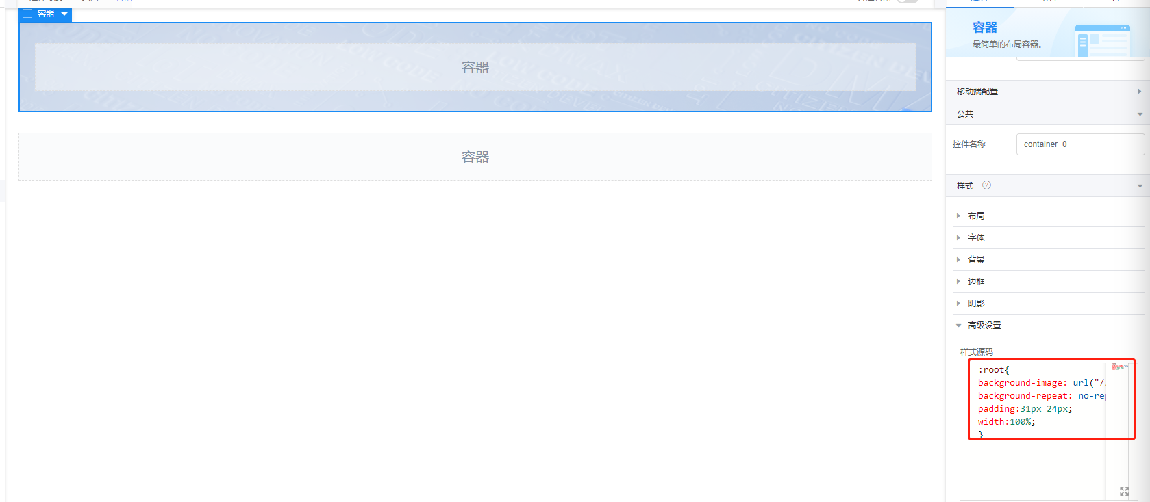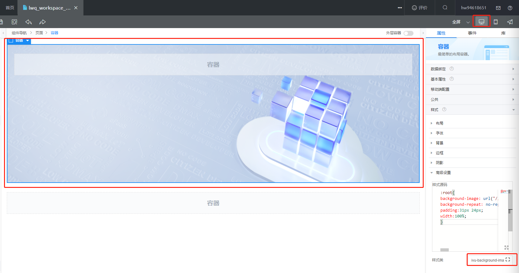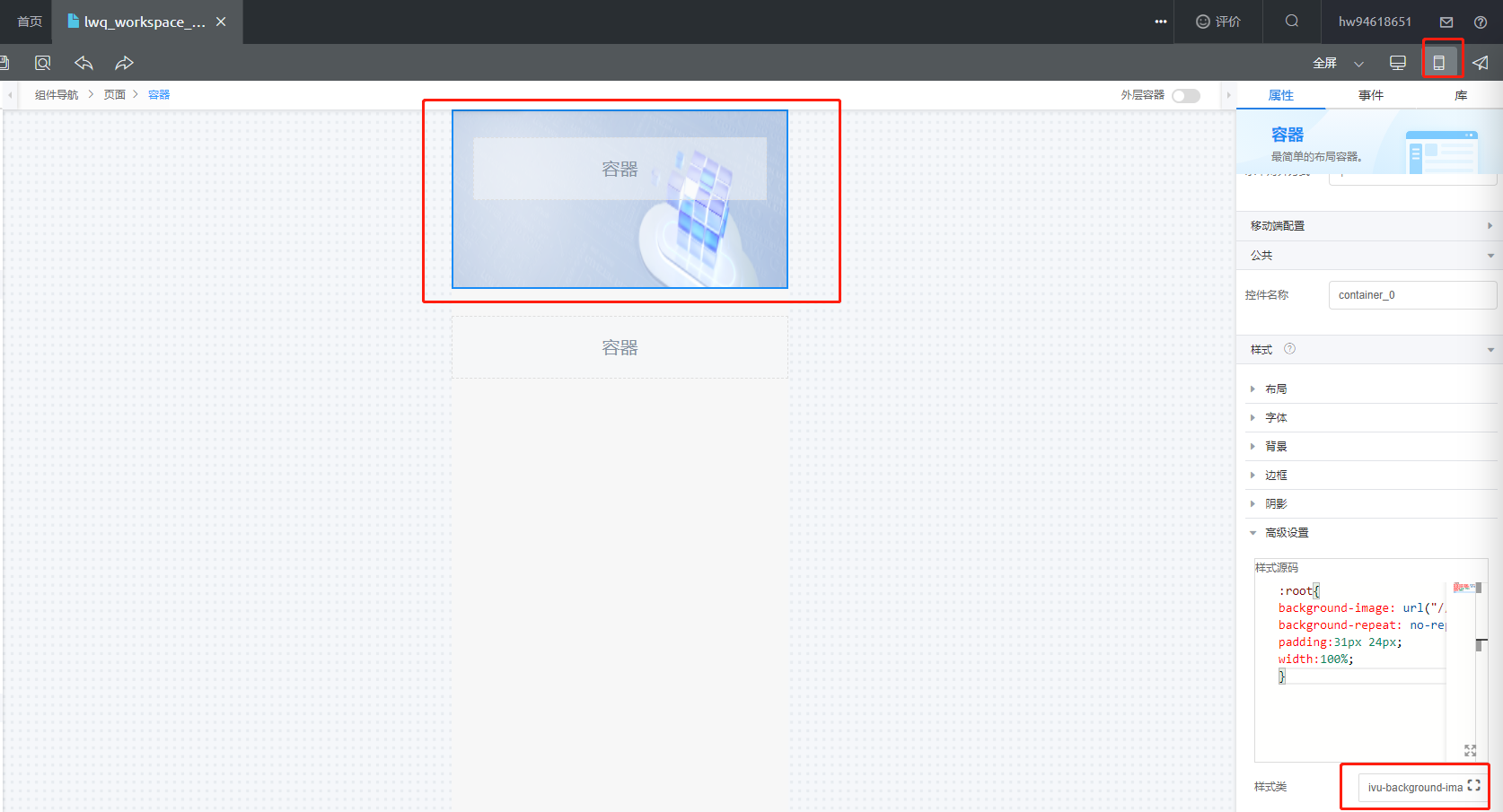 (4)在”样式代码“选项卡中设置第一个容器的样式类(主要用于区分PC端样式和移动端样式),样式类ivu-background-image-height代码如下: