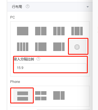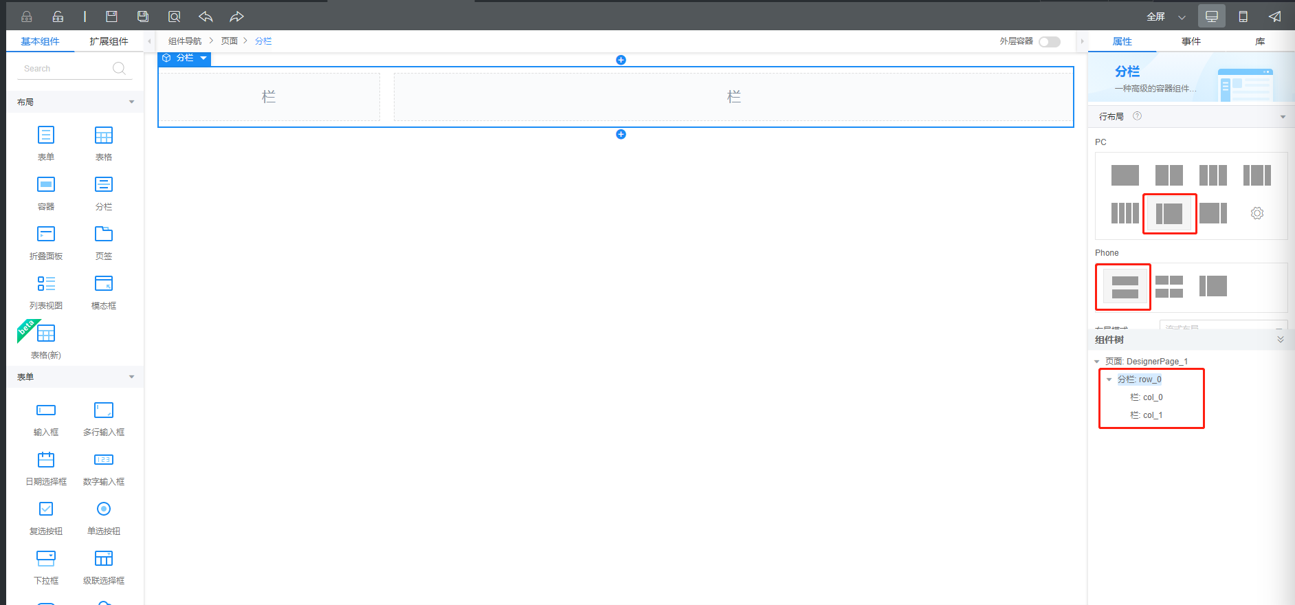 (1)拖放一个”分栏组件“到界面上,按如下截图设置对应的PC端属性和Phone端属性。