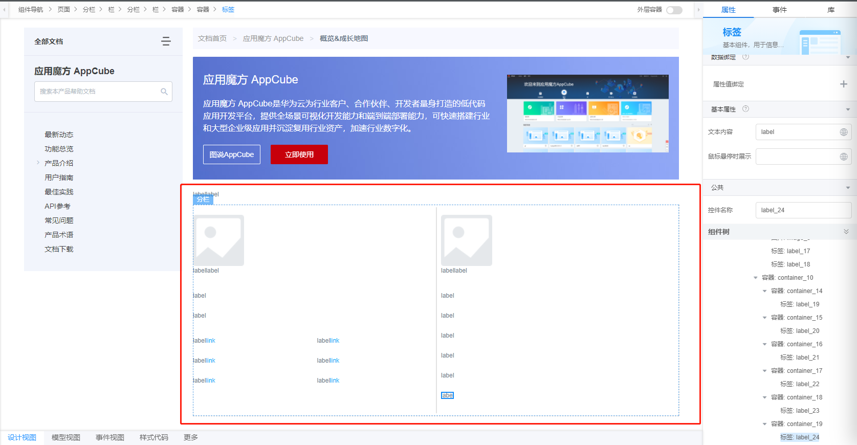 属性修改:设置文本内容为“应用魔方 AppCube是华为云为行业客户、合作伙伴、开发者量身打造的低代码应用开发平台,提供全场景可视化开发能力和端到端部署能力,可快速搭建行业和大型企业级应用并沉淀复用行业资产,加速行业数字化。”。