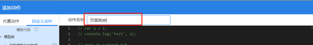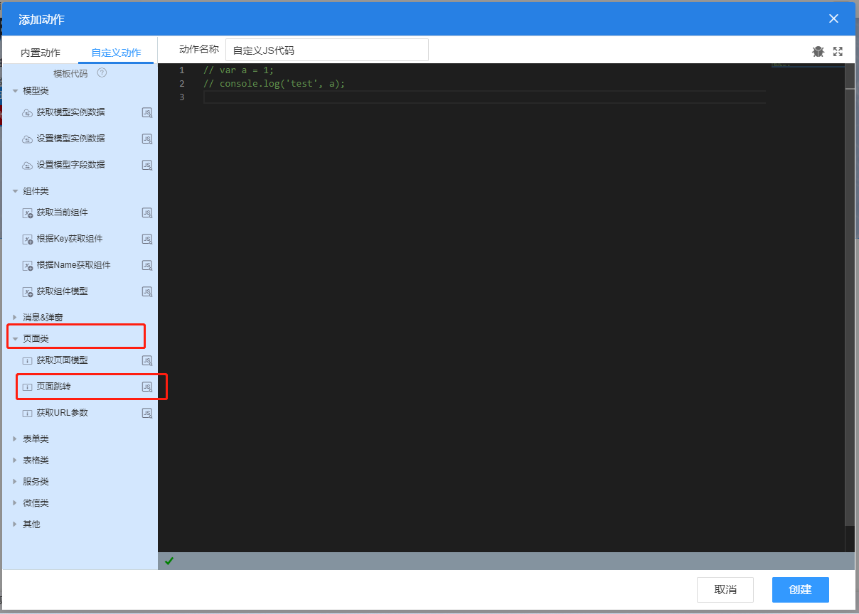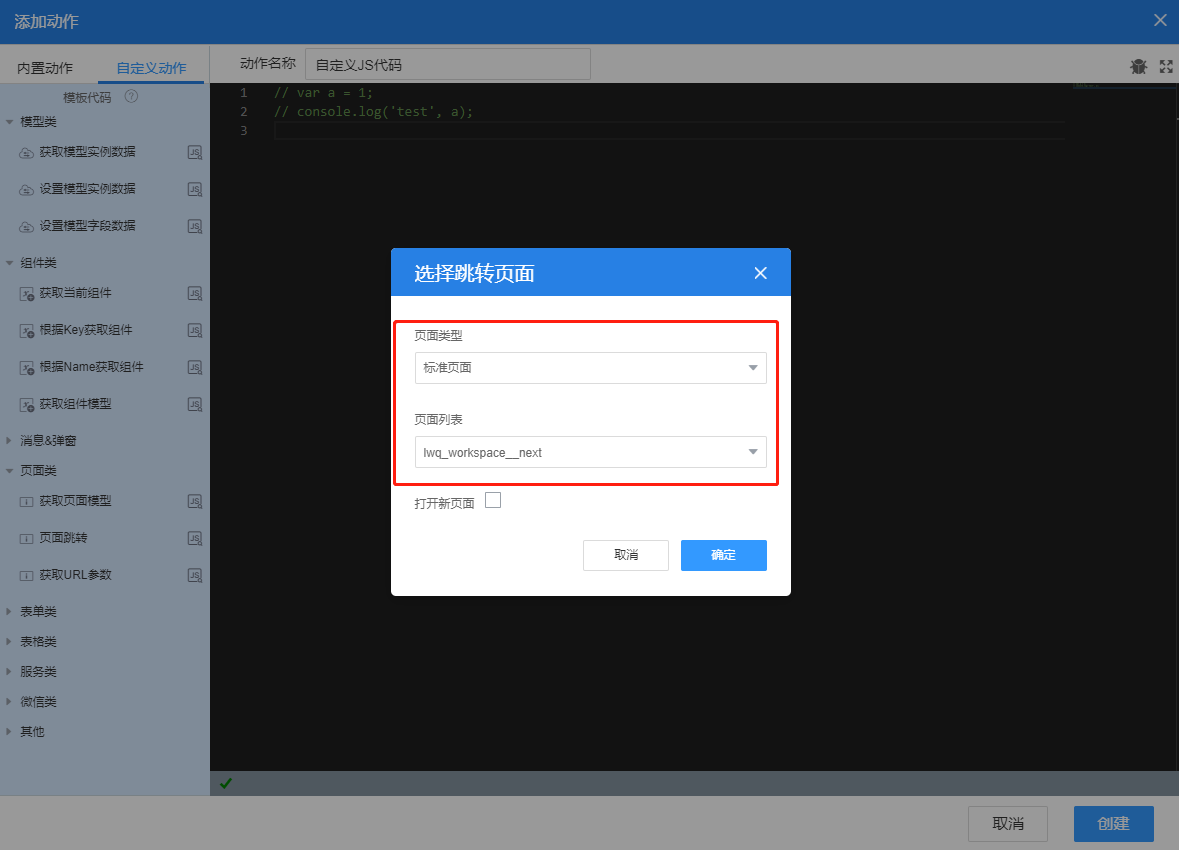 (5)修改动作名称,点击创建,即完成页面跳转配置