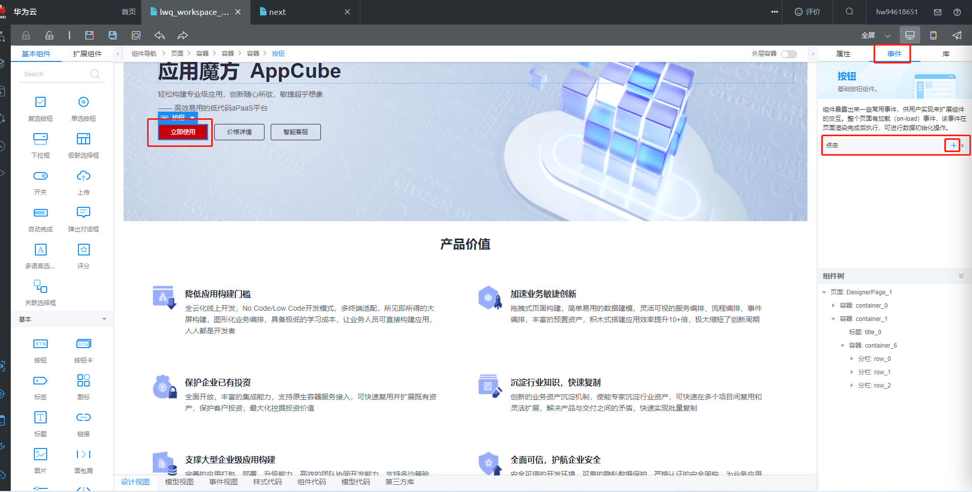 (1)在home页面选中“立即使用”按钮,右侧选择“事件”选项卡,点击加号添加按钮事件: