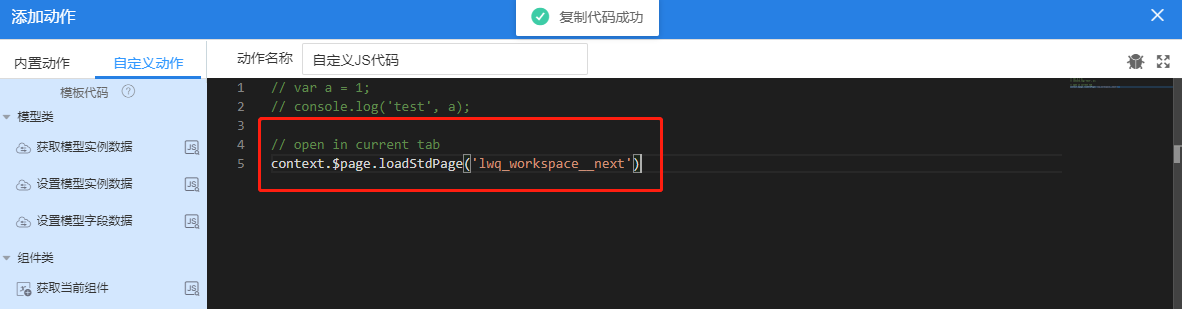 (3)根据自己情况选择要跳转的页面,此时会提示“复制代码成功”:
