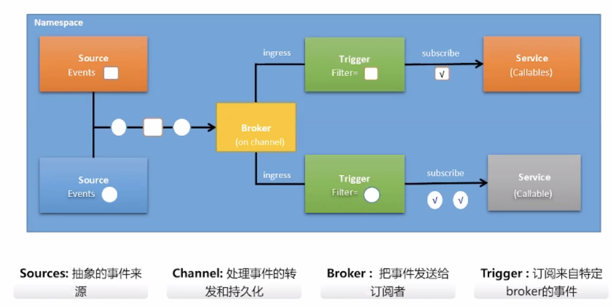 事件从源发出,Broker接收后根据Trigger的定义(过滤),消息传给对应的Service。