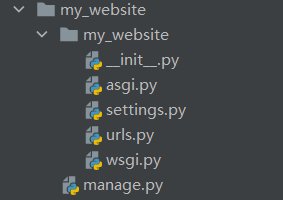 my_websitemy_website__init__.pyasgi.py: ASGI 服务器部署信息setting.py:项目配置信息urls.py:网站路由设置信息wagi.py:部署信息