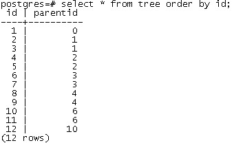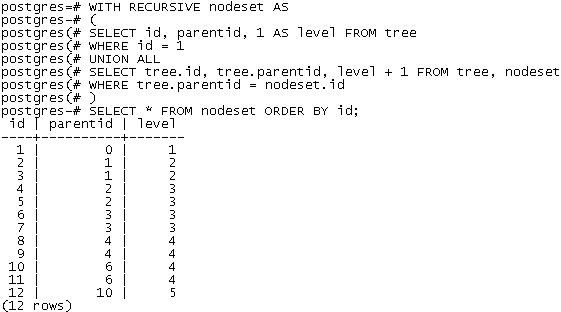 通过以下WITH RECURSIVE语句,我们可以返回从顶层1号节点开始,整个树的节点,以及层次信息: