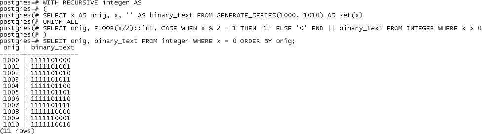 SELECT orig, FLOOR(x/2)::int, CASE WHEN x % 2 = 1 THEN '1' ELSE '0' END || binary_text FROM INTEGER WHERE x > 0