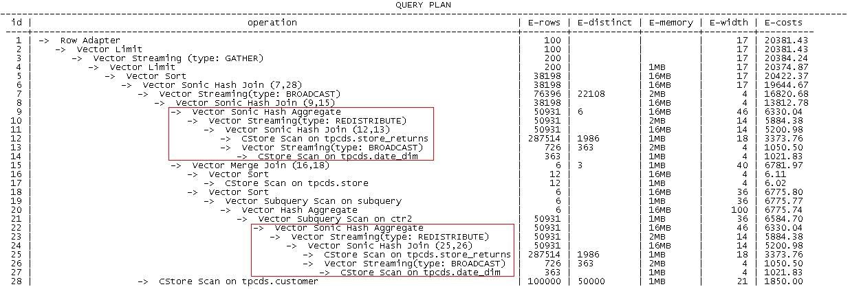 第15号算子即CTE Scan,对CTE customer_total_return的结果进行缓存,供第8号和第14号CTE scan算子使用。