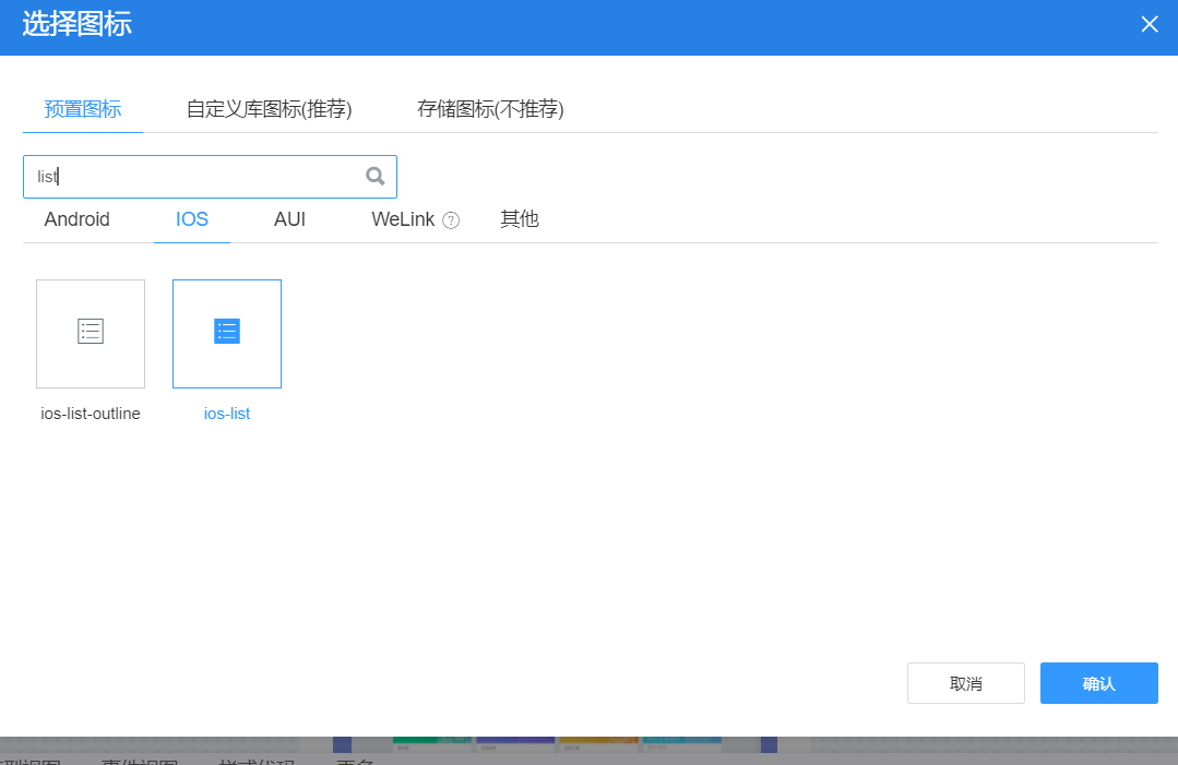 上半部分相信大家也熟悉了、理解了,这里的思路是:拖入标题,进行居中,图标定位,再拖入一个容器给他背景色换为#F7F8FB;然后一顿root样式代码操作,就变成了这个样子,菜单的图标可以 直接在预置图标搜索list找到。