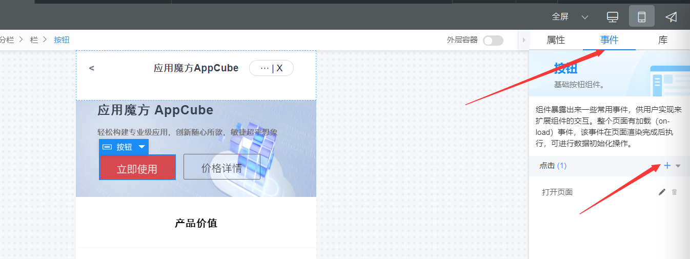 因为要求点击第一个立即使用的按钮会跳转第二个h5页面,所以这里我们还要添加一个点击事件。选择事件---+号,选择点击事件