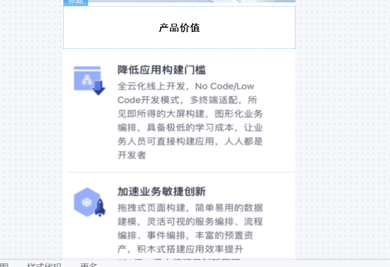 下面的部分拖入一个标题,再拖入一个容器,给他设置宽高,换背景颜色,再将三段文字+图标排版、定位即可。