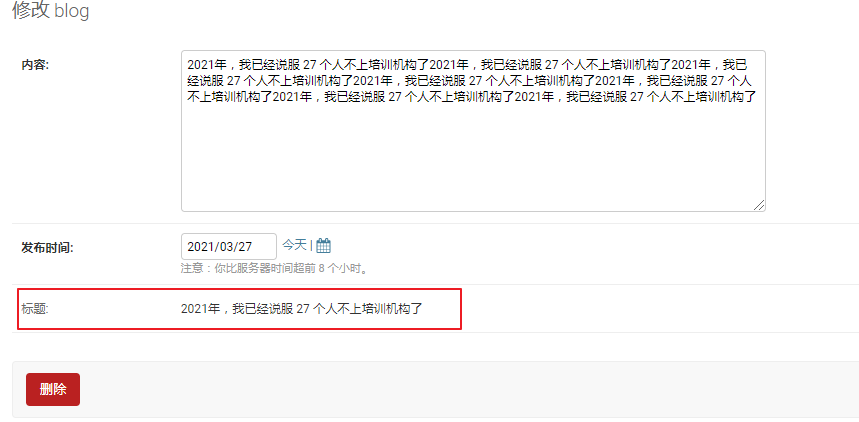 在 Django 中,可以设置某些字段不被修改,只读。例如,我们将发布时间设置为只读字段。