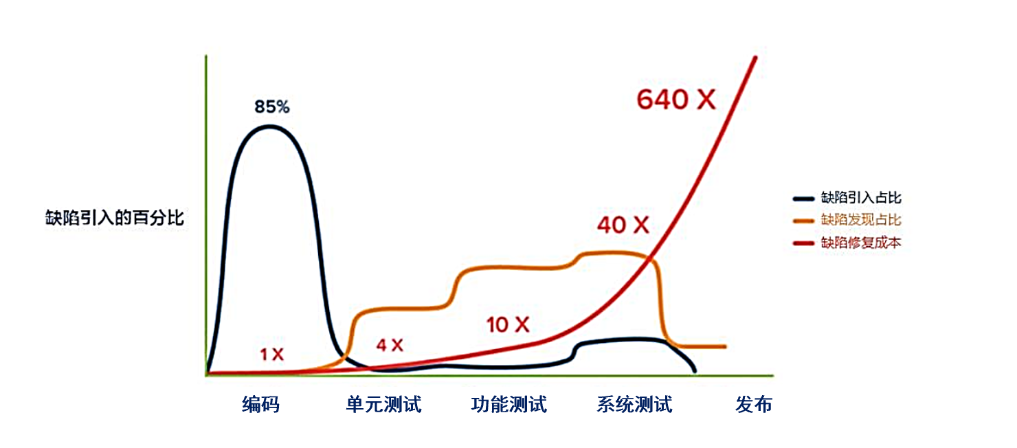 同时,从缺陷修复成本上看,戴明曾提出“缺陷发现得越早,修复的成本越低”。有数据指 85% 的缺陷都是在代码编码阶段引入的,然而大部分的缺陷并不是在编码的时候发现的,而是在之后的测试阶段发现的,甚至是已经上线后。而且随着越往后发现缺陷,修复的成本也越高。