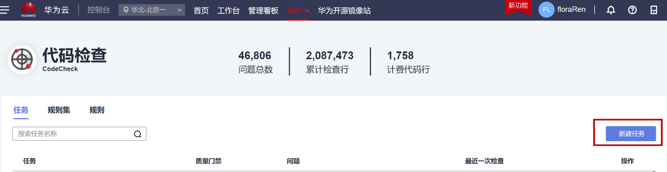 在 华为云DevCloud 首页工具栏选择“服务 > 代码检查”进入,或者点击 Code Check 进入。单击“代码检查”首页的“新建任务”创建代码检查任务。