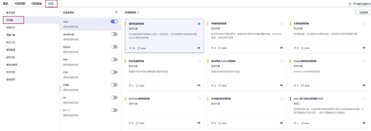 创建任务后,可以在设置中进行规则集选择。Code Check会识别到代码中包含的语言,然后在对应的语言规则集中选择中选择对应的规则即可。CodeCheck 可以 支持 Java、JavaScript、CSS、HTML、PHP、C#、Android等常见 10 种开发语言,还可以多种语混合检查;可以提供近2000条华为典型检查规则,支持web检查、安全检查、架构检查、编码问题检查等场景。