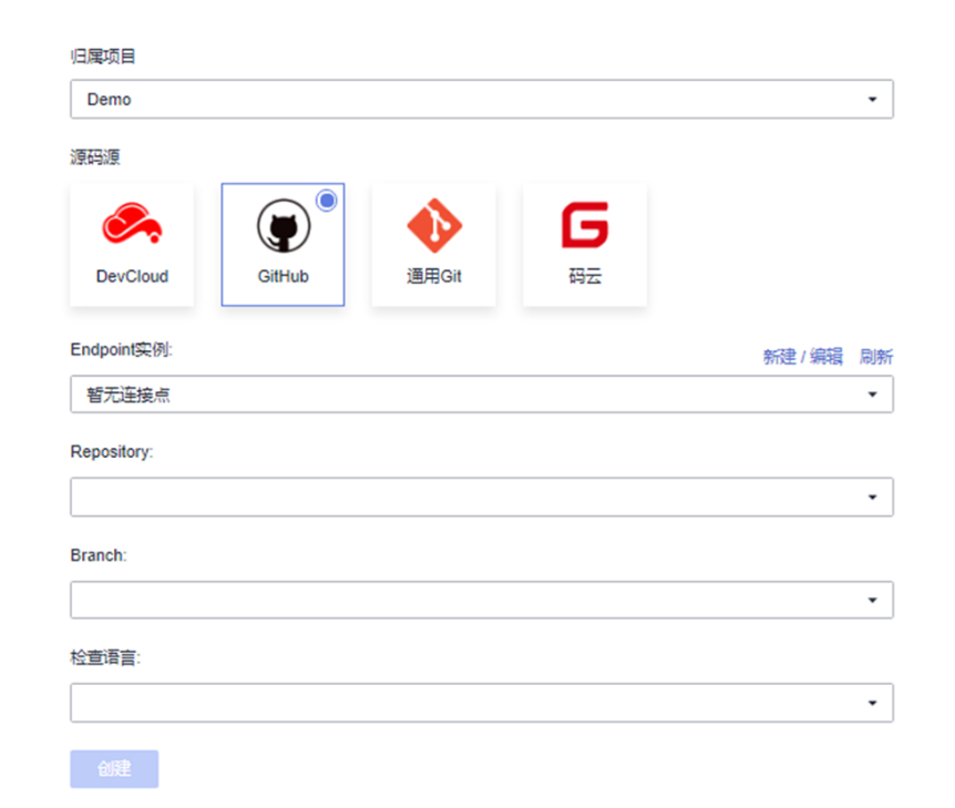 创建任务时通过关联项目下代码仓库拉取代码。源代码有4个来源可选,不同的选择要填写对应的参数值,同时选择代码工程的语言类型。