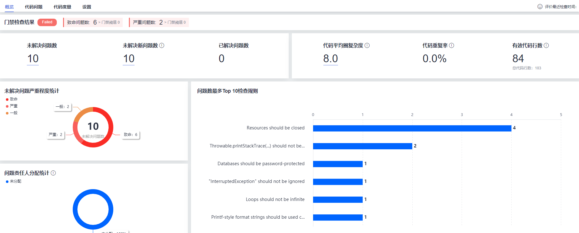 检查后可以提供多维度报表,单击检查任务名称链接,进入代码检查任务详情页面,可以查看“概览”、“ 代码 问题”、 “代码质量”、 “圈复杂度”、“代码重复率” 等信息 。