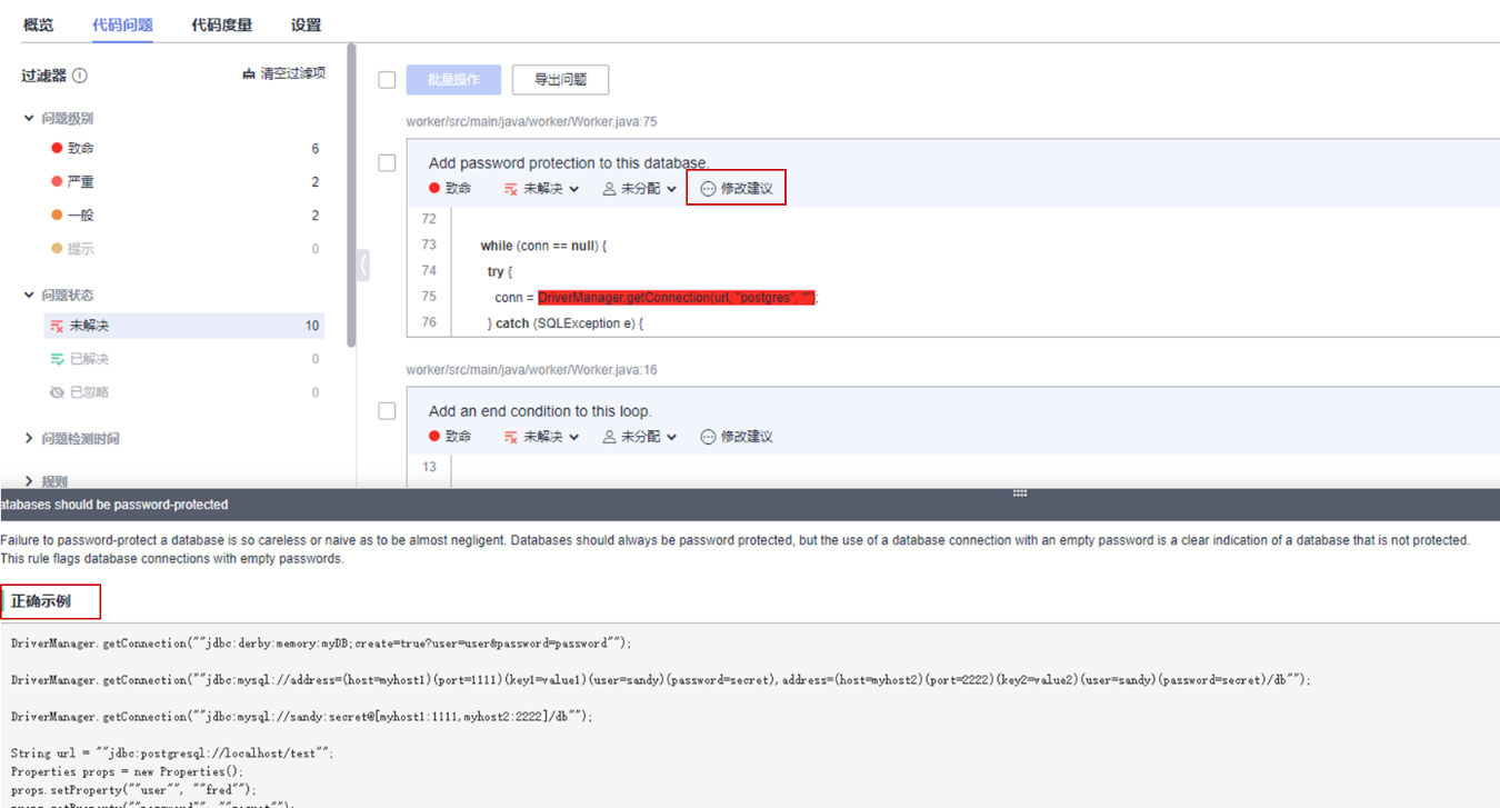 检查后会根据问题级别进行分类显示,并提供详细的缺陷影响说明、正确示例、错误示例、修改建议。