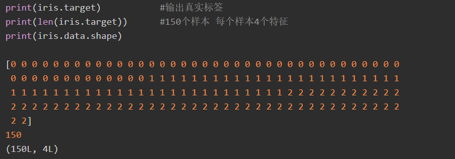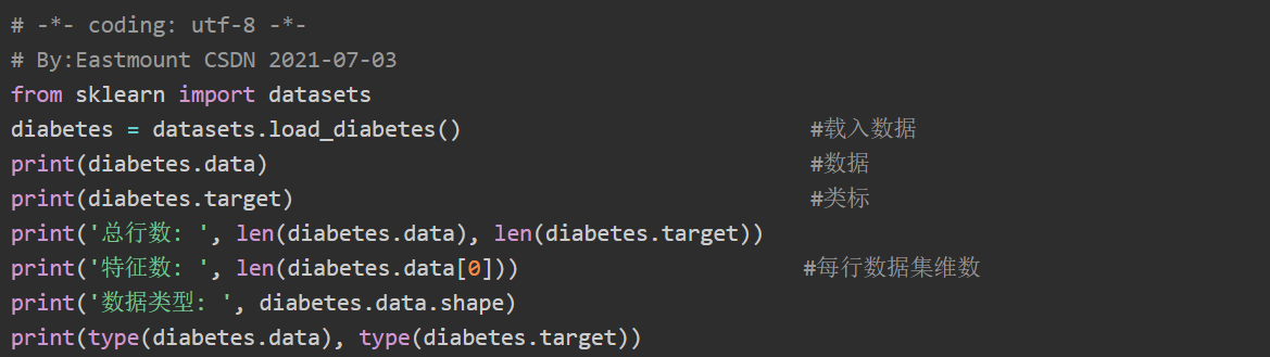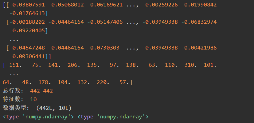 调用load_diabetes()函数载入糖尿病数据集,然后输出其数据data和类标target。输出总行数442行,特征数共10个,类型为(442L, 10L)。其输出如下所示: