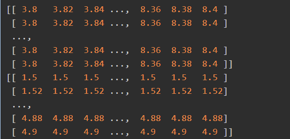获取鸢尾花数据集的两列数据,对应为花萼长度和花萼宽度,每个点的坐标就是(x,y)。 先取X二维数组的第一列(长度)的最小值、最大值和步长h(设置为0.02)生成数组,再取X二维数组的第二列(宽度)的最小值、最大值和步长h生成数组, 最后用meshgrid函数生成两个网格矩阵xx和yy,如下所示: