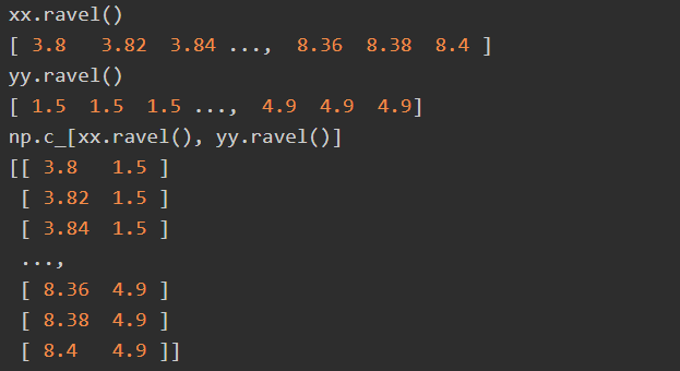 调用ravel()函数将xx和yy的两个矩阵转变成一维数组,由于两个矩阵大小相等,因此两个一维数组大小也相等。np.c_[xx.ravel(), yy.ravel()]是获取并合并成矩阵,即: