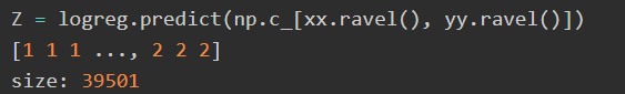 - Z = logreg.predict(np.c_[xx.ravel(), yy.ravel()])