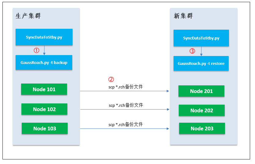 集群数据迁移框架是在SyncDataToStby.py工具中实现的,同时部署在新老集群上,该工具负责在生产集群上拉起GaussRoach.py -t backup备份任务,在新集群上拉起GaussRoach.py -t restore恢复任务。生产集群上由Roach备份生成的*.rch备份压缩文件,通过scp命令传输到新集群上,新集群通过Roach工具解压这些*.rch备份文件,从而将生产集群的数据文件以物理恢复的方式同步到了新集群。具体框架如下,细节本文不做展开描述。