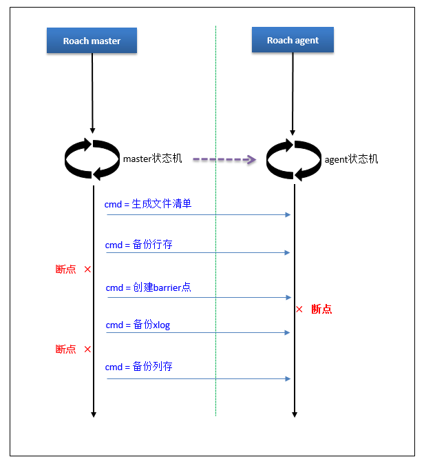 为节省内存开销,主节点的gs_roach同时兼任Roach master和Roach agent身份。Roach master维护一个状态机,与其余节点的Roach agent通过TCP长连接进行通信,前者扮演主控角色,给其余节点发送命令,通知它们按状态机的次序逐个完成各项子任务,并控制其余节点的备份状态保持同步。目前集群全量备份共有十几个状态,各个Roach agent节点需要按Roach master的指令依次完成十几个子任务。Roach master会等待各个Roach agent都完成该项子任务才会推进到下一个状态。为了更好地控制分布式交互,各个Roach agent也维护了自己的一个状态机,其状态大体与Roach master的状态一一对应。