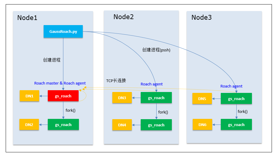 GaussDB(DWS)集群是分布式架构的,其备份工具Roach也基于分布式架构。Roach主要包括两个组件:调度框架GaussRoach.py和实际执行任务的gs_roach程序。假设集群有3个节点,用户在节点1调用GaussRoach.py发起备份操作,那么我们就将节点1称为master节点(主节点),其余节点称为agent节点。GaussRoach.py通过ssh命令给每个节点都拉起gs_roach进程,后者根据本节点DN个数fork相应数量的gs_roach子进程,每个gs_roach进程负责一个DN的备份任务。备份任务结束后,所有gs_roach和GaussRoach.py进程退出。同一时刻,集群内所有DN相当于都在并行备份数据。
