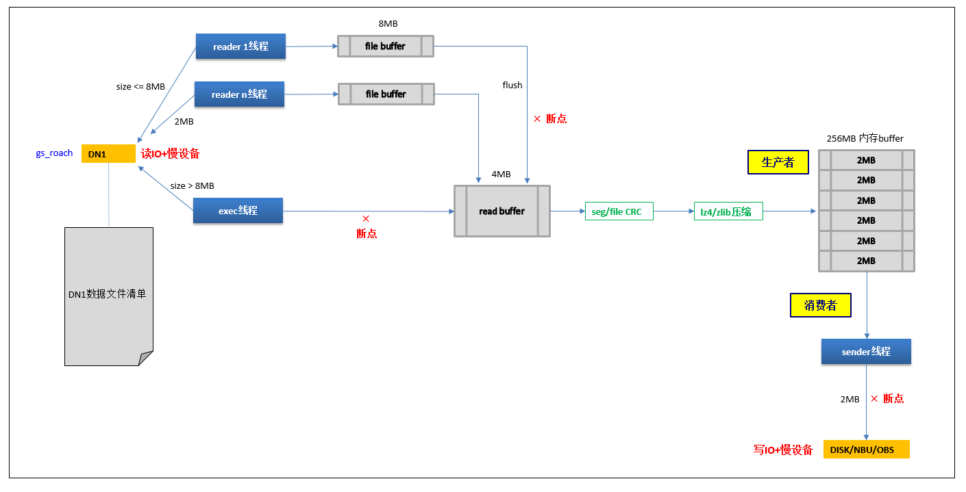 下图是Roach备份过程中的生产者-消费者模型示意图,有助于大家理解这个过程。图中标记了几个典型产生断点的地方。