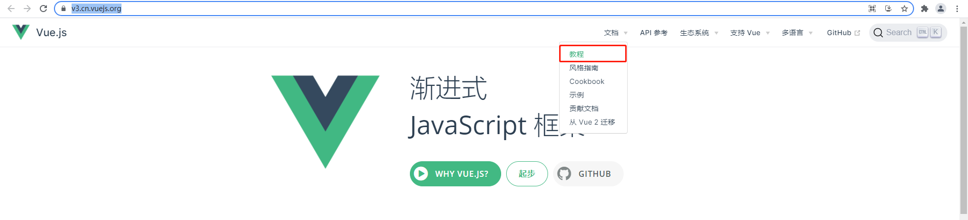 (2)在文档菜单中选择教程,打卡Vue3教程界面