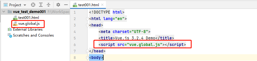 说明:如上图所示,Vue.js库文件包含两个版本,分别是“开发版本”和“生产版本”。vue.global.js是“开发版本”的js文件,该版本包含完整的警告信息和调试模式。vue.global.prod.js是“生产版本”的文件,该版本删除了相关警告信息(体积更小、运行更快),用于最终打包发布时使用。